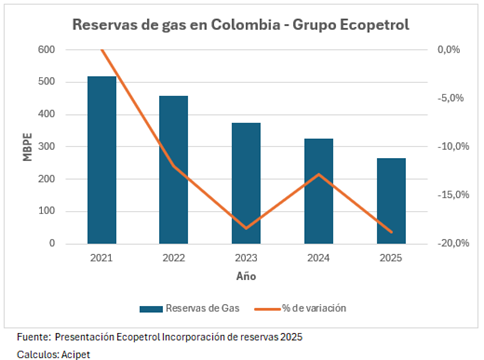 Lo anterior ocurre a pesar de que las cifras reportadas de producción de gas en 2025 muestran una disminución de la declinación, que denotan mejores declinaciones, asociado a los campos de Pauto y Floreña en el Casanare y los campos Chuchupa y Ballena en la Guajira.