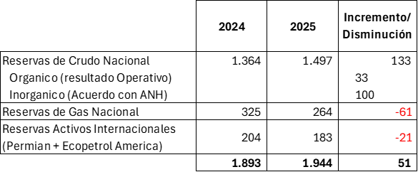 Que en 2025 el Grupo Ecopetrol incorpore 300 millones de barriles de petróleo equivalente (MBPE) en reservas probadas (1P) constituye un resultado positivo. Esta incorporación permitió un incremento de 2,69 % en las reservas de la compañía, al pasar de 1.893 MBPE en 2024 a 1.944 MBPE en 2025.